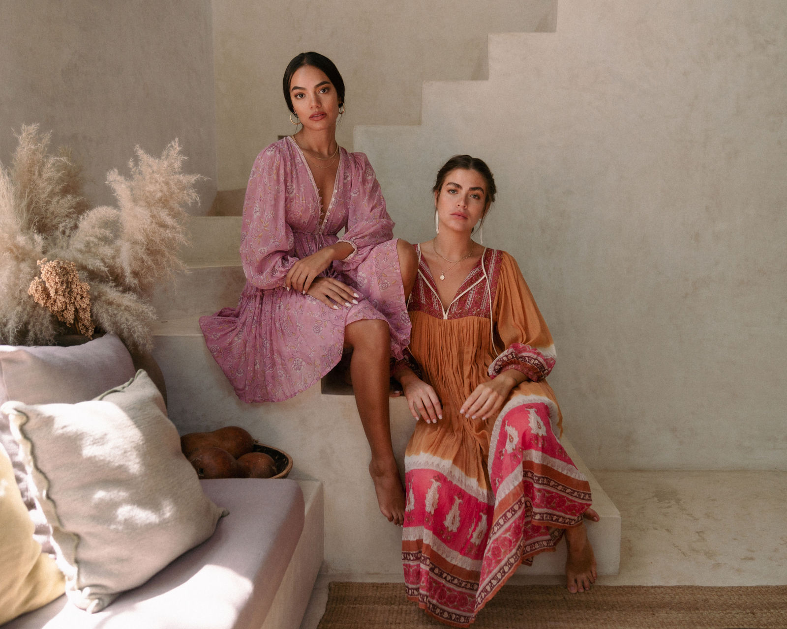 A style in trend is a Alani Sunset Midi Dress for us. Inspired from 60s gypsian fashion, its balloon out sleeves makes it a traditional and effortless dress. With tie on the neck and print on the bottom hem, Alani dress is perfect for the brunch. We recommend pairing with cowboy boots or heels and a big shopper bag. For a more relaxed look, pair it with lace-up flats and a bandana. The earthy saffron colour adds to its starkness. We were flabbergasted by how the tie-dye with hand block printing looks on this dress. This sure is a stunner!