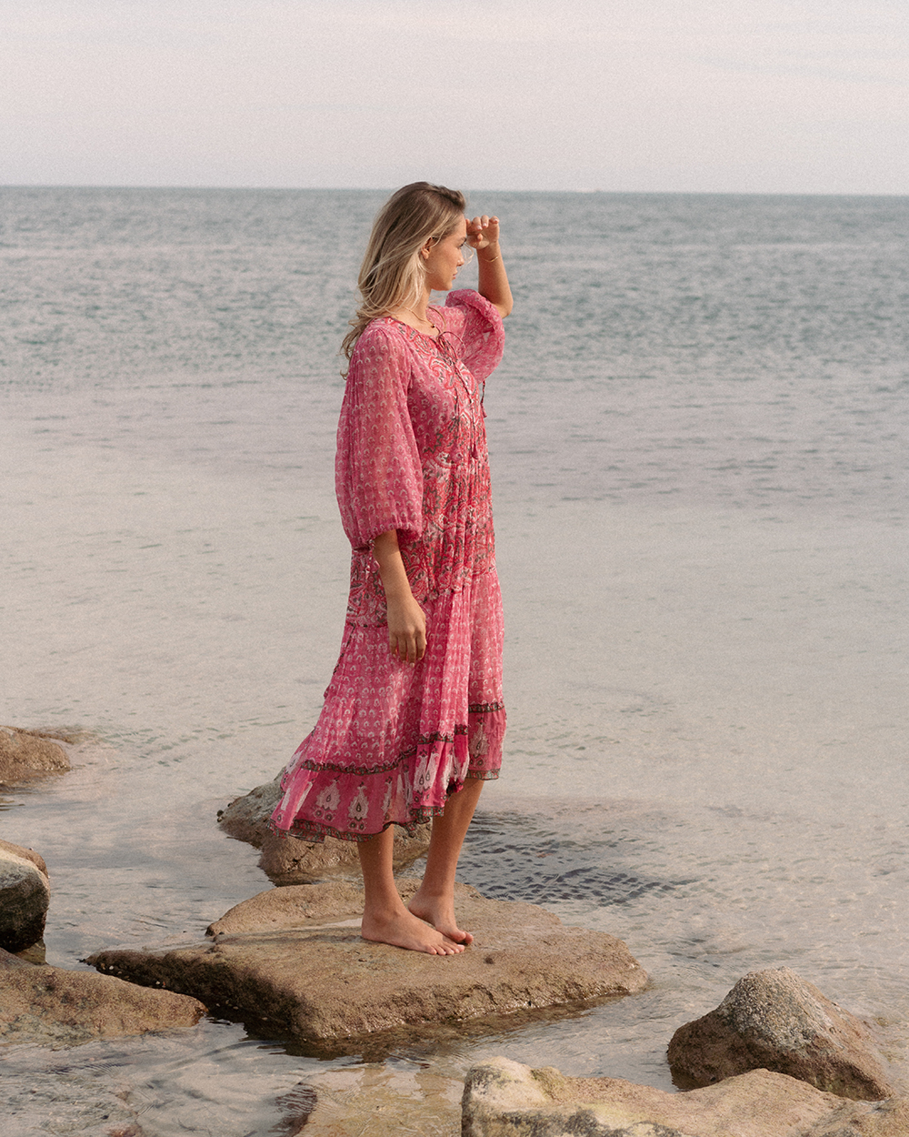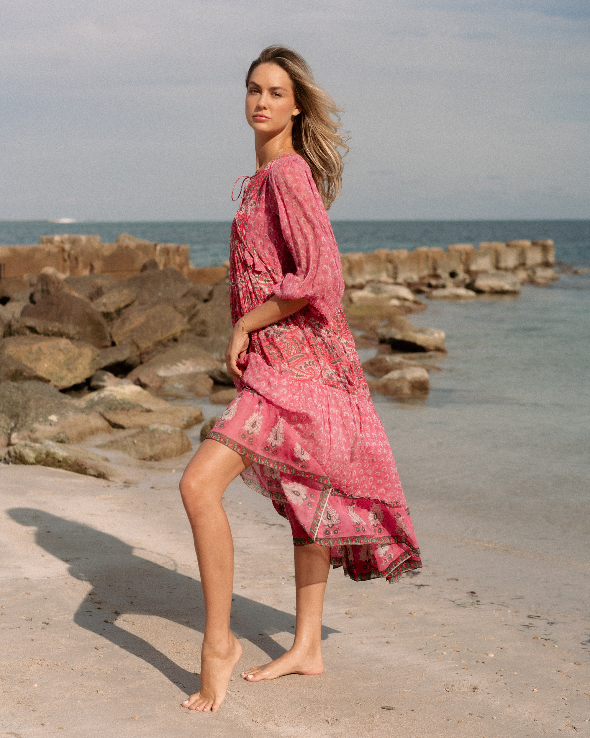 With frilled bottom and ties in the waist to give your body that feminine structure, this dress speaks of histories of romances. It is a perfect outfit of comfort and gracefulness. The ties on sleeves is made in very soft fabric that your body is going to fall in love with. This pink print with green detailing has been our favourite since forever. Gorja Maxi dress is also available in mini version.