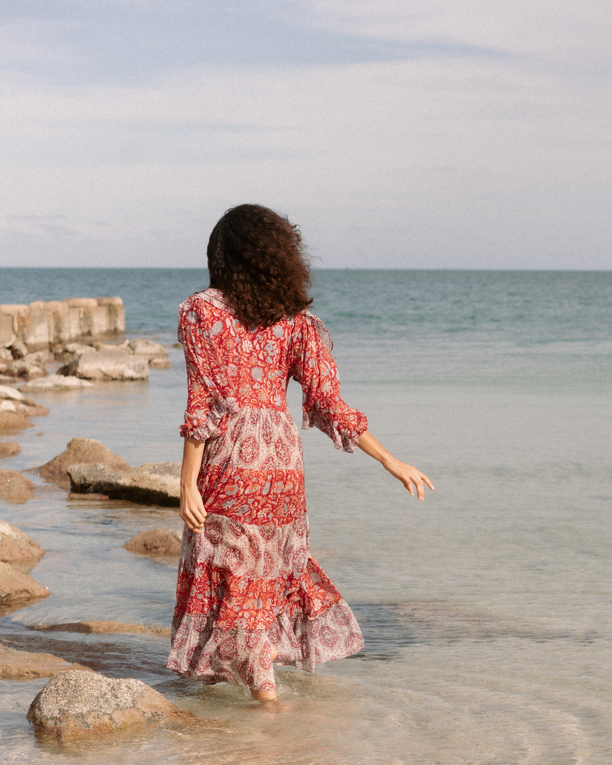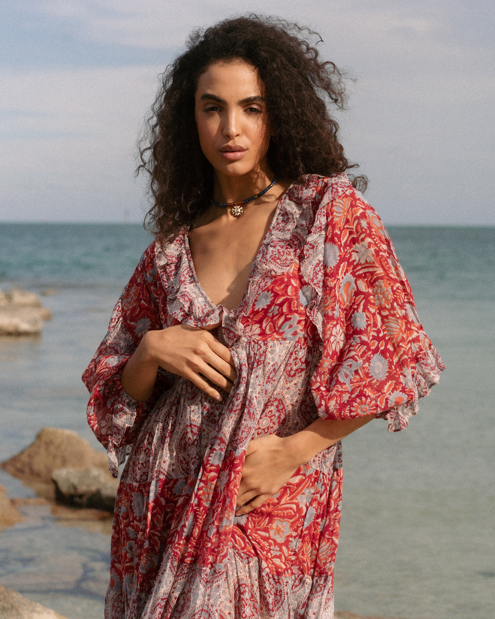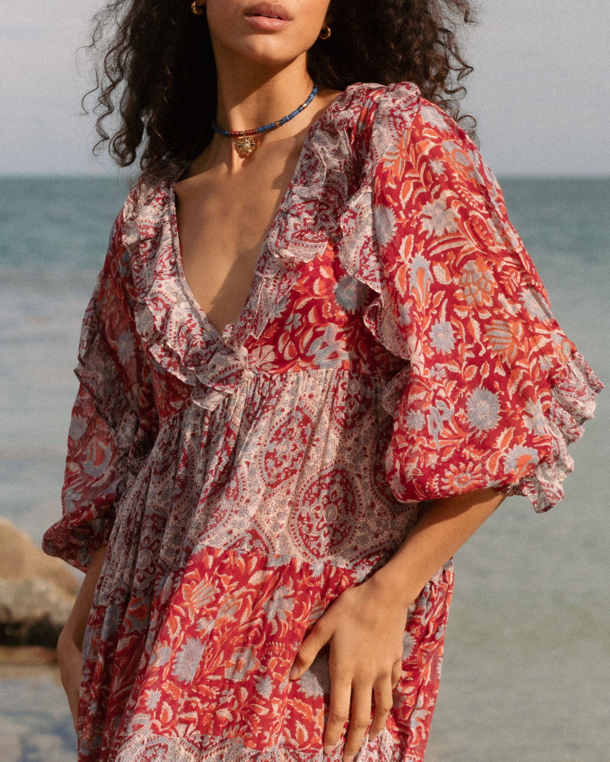 What a beauty! It is another colour of our favourite dress of this collection. The frills and skirt will make you feel like a thriving queen in this dress. Pair it up with a big pendant to highlight its beautiful frilled V neckline. We have used two block print designs to complement each other in red tones. Imagine that one rebellious and hippy soul in the family gathering who always brings colours and laughters.