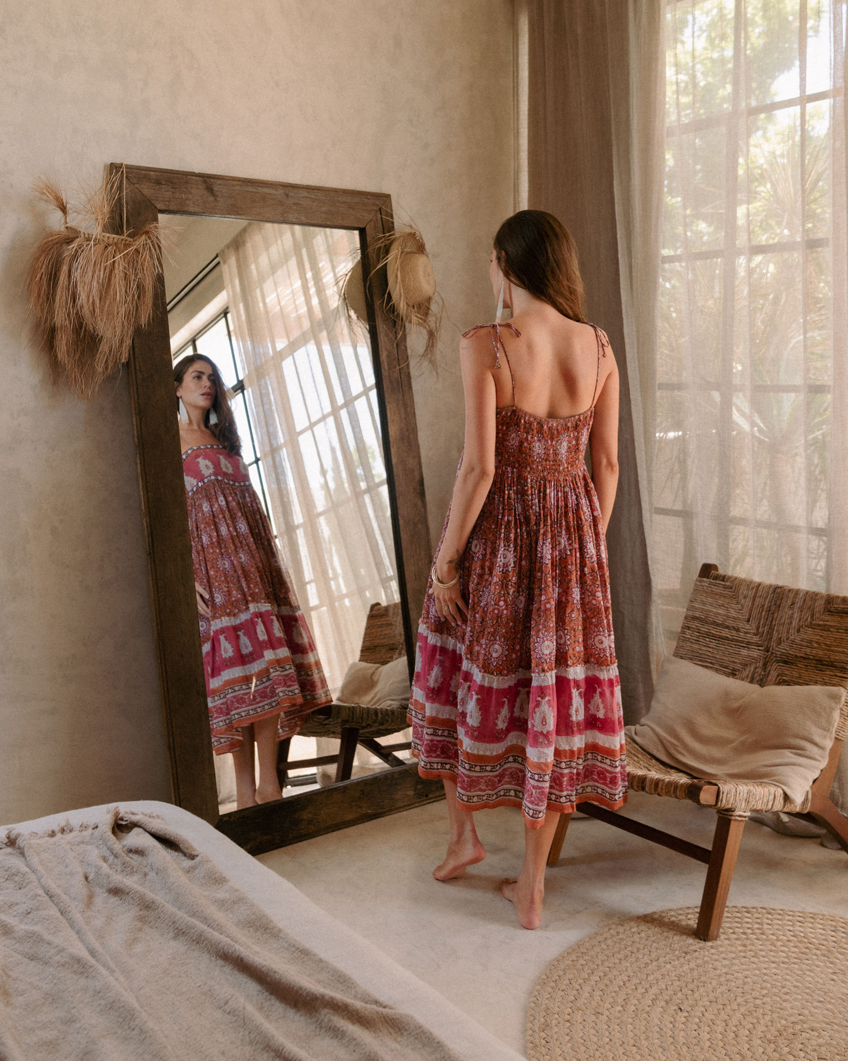 Kailasa Midi Dress is sure going to win hearts. The silvery lines in the fabric shines among its saffron and hot pink colours. This scrappy dress is our most awaited creation. This dress reminds of 1950-1970 hippie trail that came to India. The old Mughal boota in the chest piece is a statement of indigenous people of India in Himalayas. Adjustable straps for an easy wear. The elastic back piece to give the perfect fit to all body types. This gorgeous bottom has a voluminous skirt just like all the others in this collection.
