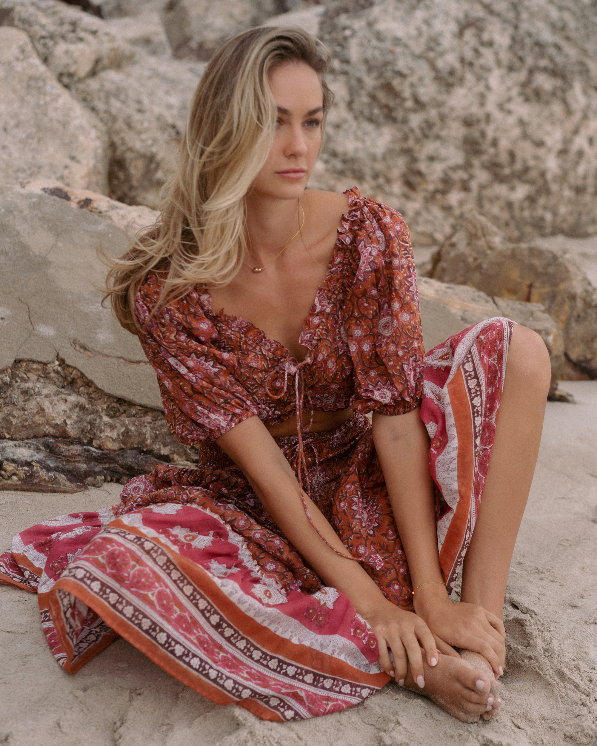 A very chic and effortless top with ties in the centre body of the top. Elasticated sleeves that can be worn as off-shoulder as well. The fabric quality and colours used in Kailasa top will give that queenly feeling. It is designed to give ease as well as versatility in your outfit. Pair it up with jeans and a denim jacket for a chic look and they are going to fall in love with you or wear the same skirt for a vacay mode!