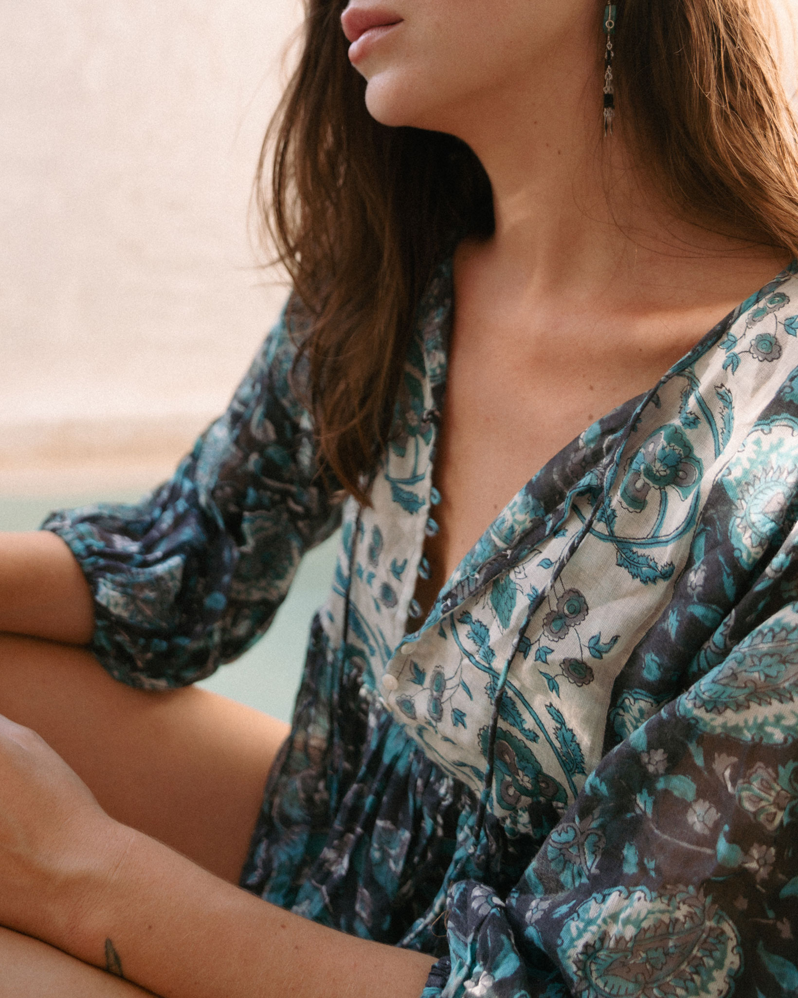 We couldn’t get enough of this charcoal color fabric so we decided to create a top and a skirt with it. What a wonderful chest shape is there on the top. Pair it with the matching skirt. A chronicle of gypsian fashion conveys in its details around the border. Quintessential bohemian dress for girl going on a vacation in Egypt.